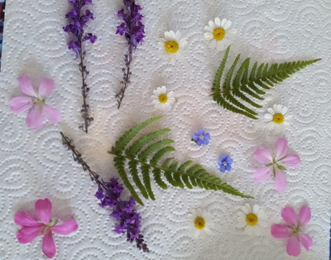 2. Pressed flower bookmarks - These make a lovely keepsake or gift idea and are very simple to make. We collected a variety of flowers and leaves from around the garden (less "bulky" ones are preferable) and pressed them in a fold of kitchen towel under a pile of books. After several days they were dry enough to be carefully mounted on card or laminated into bookmarks or pictures.